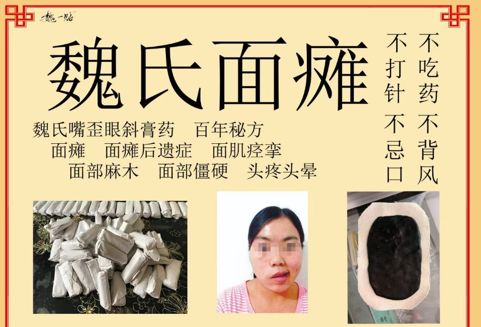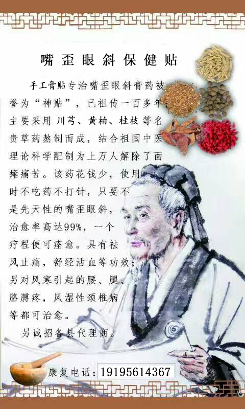介绍:祖传秘方100多年 自己熬制的膏药 一年左右的患者6-10贴膏药就能治好 一贴膏药用6天 嘴往右歪贴左边 嘴往左边歪膏药贴右边 治疗期间不吃药不打针 不忌口不背风 但不要喝酒不吃辣椒【详细】