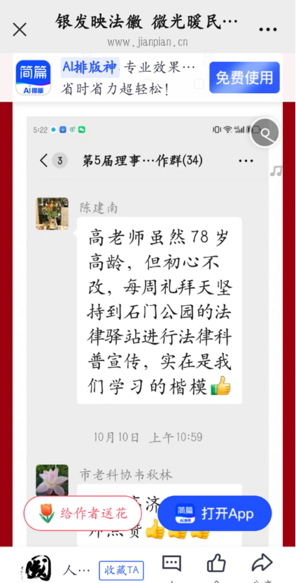 今年4月,南宁市融媒体中心推出“微公益进公园”活动,高济昌主动请缨担任法律顾问。他的咨询台没有名衔堆砌的展板,只有手写的“婚姻继承”“劳动纠纷”等分类纸牌。短短一个月内,他接待咨询 23人次。有位李阿姨带着房产纠纷材料三度来访。“高老师查遍《民法典》,还帮我联系了专业律师。”她展示手机里存着的调解协议说,“这比花钱请的律师还用心!”法律榕树讲堂活动已成石门公园新名片。
