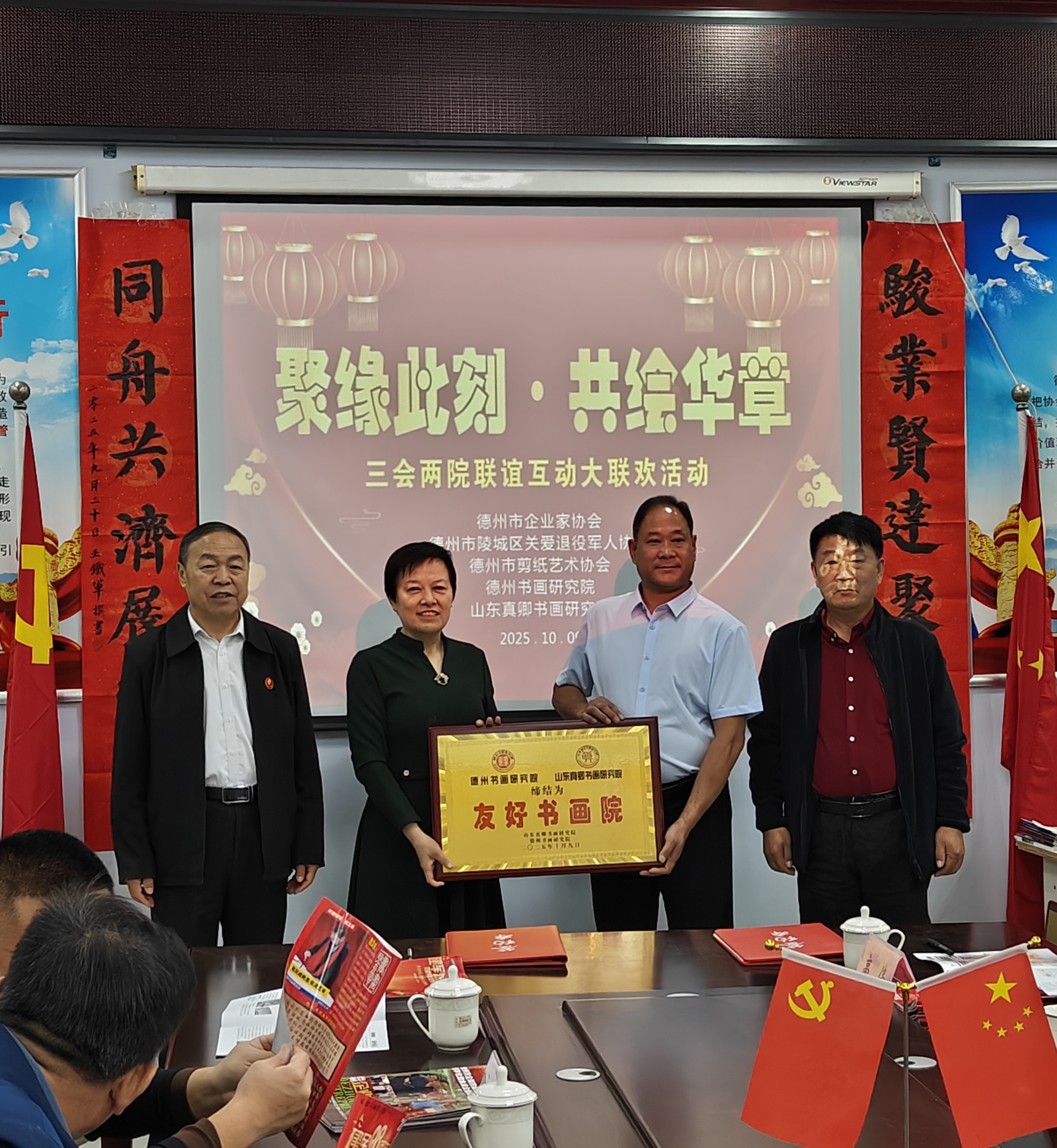 本网讯(蓝乙人 蒙仕荣 联合报道)10月9日,德州市企业家协会携手德州市剪纸艺术协会、陵城区关爱退役退伍军人协会、山东真卿书画研究院、德州书画研究院,共同举办“三会两院”联谊会。德州市企业家协会会长祖传鹏、副会长陈建州、秘书长孙长梅、李旭鹏,德州市剪纸艺术协会会长石成才,陵城区关爱退役退伍军人协会会长陈凤亮,山东真卿书画研究院院长赵义成,德州书画研究院副院长魏勇君、秘书长孙长梅等参加活动。