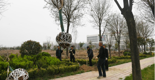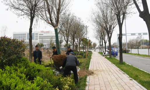 世界经济合作网(杨秀文 温徐旺 梁文建/图文) 3月23日,在闻喜县工业园区大道绿化带旁,园林工人正小心翼翼地将一棵棵新移植的风景树木栽入土中,培土、浇水、支撑,每一道工序都一丝不苟。