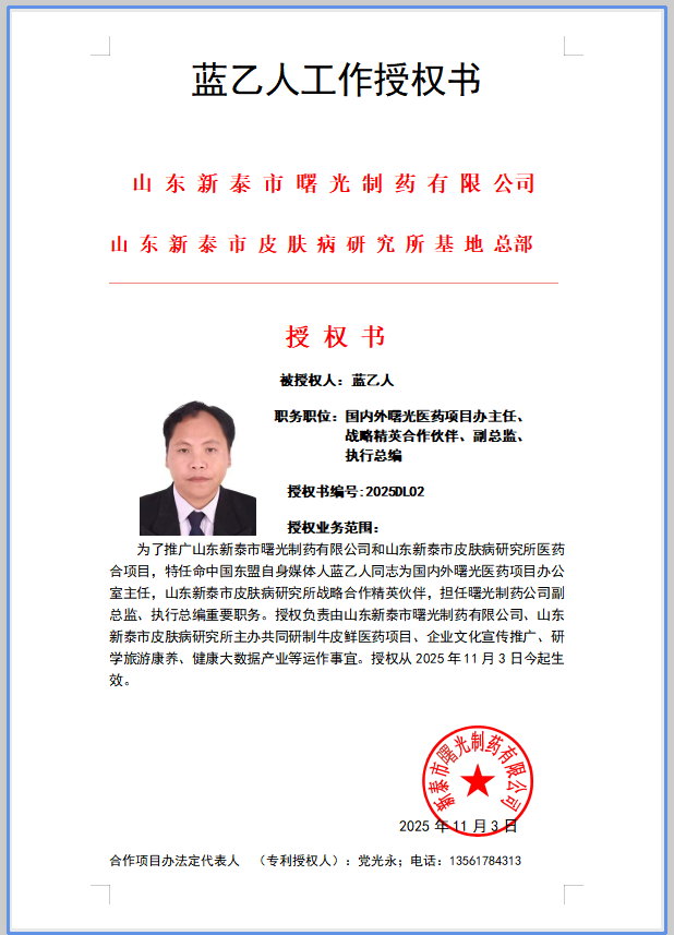 2025年11月3日,记者从山东获悉:中国东盟资深媒体人、国际环境新闻网常务总编蓝乙人应邀正式被聘为山东省新泰市皮肤病研究所战略精英合作伙伴,同时担任山东新泰市曙光制药有限公司副总监兼任执行总编辑职务工作。