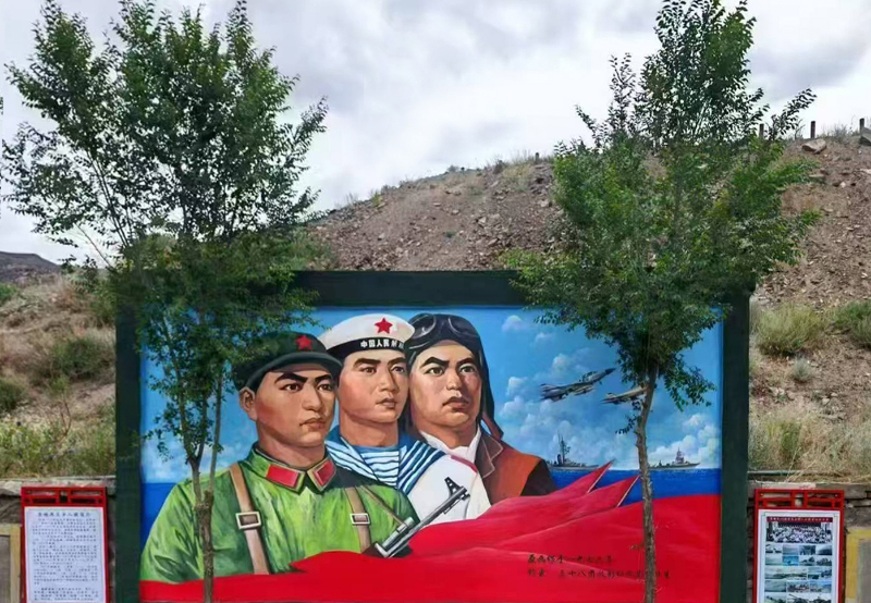 曾经中国人民解放军炮兵第三十八团服役的郭秀明、杨振新、刘益民、刘建忠、梁治龙、杨建华、李晋林、赵琦、沙国林、陈明、何竹林等战友携手,一起为修葺1976年矗立于炮兵第三十八团俱乐部广场前右侧山脚下、由其时电影组放映员林生画师创作的那巨幅宣传壁画,给战友们留得了深深的回望印记,体现时刻牢记伟大统帅毛泽东主席教导“提高警惕 保卫祖国”的革命军人共同心境,并为曾得毛泽东主席的题词“人们的砲兵万岁”“为建设强大的人民砲兵而奋斗”深感自豪和幸慰!