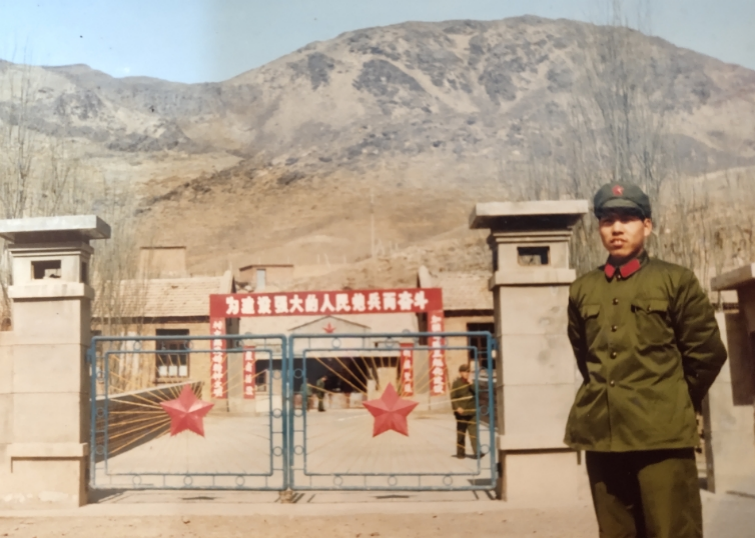 9、其中驻守天山牧场地域的炮兵第三十八团直属指挥连侦察排战士李培林198310月在团部大门前。  李培林  提供