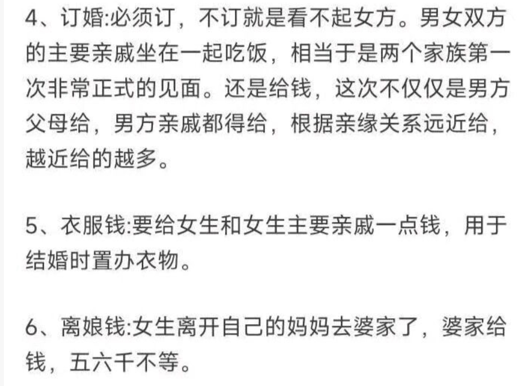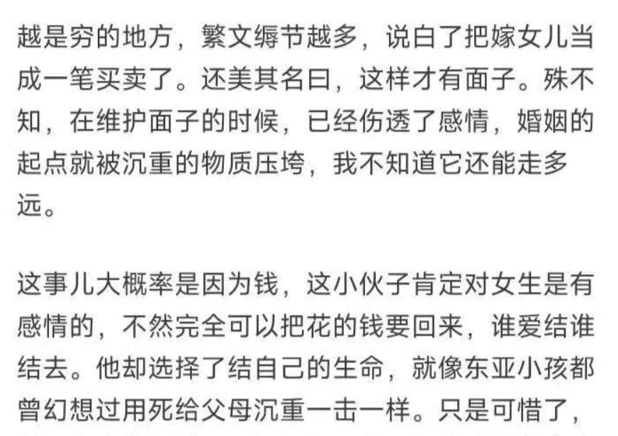 换句话来说,是什么样的原因促使他走到这一步的呢?尽管当地官方层面说是琐事引发,并非由彩礼引起,但网友们依然从当地的结婚习俗这个层面去观察发现。