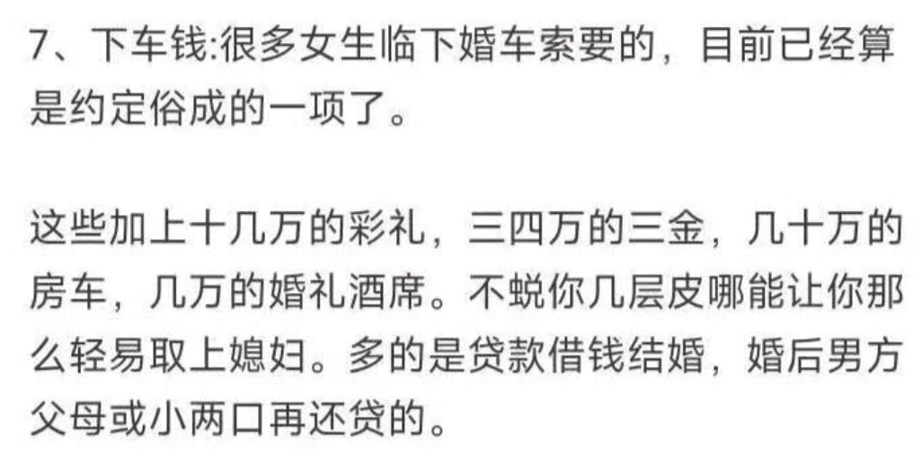 于是在这么多要钱的习俗中,很多婚姻从开始阶段就没了感情,有的只是相互算计,甚至是埋怨。