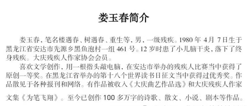 歌曲《残疾人心中的太阳》的完整音乐就这样诞生了!十多年来,娄玉春用一根手指头辛勤敲电脑,已创作诗歌、散文、小说、剧本100余万字。娄玉春期待有关慈善机关、残疾人联合会、出版社、出版商能够为他的各类文学作品寻找出版机会,然后打算用出版的稿费为残疾人办一家养老院,让他们能够安度晚年。